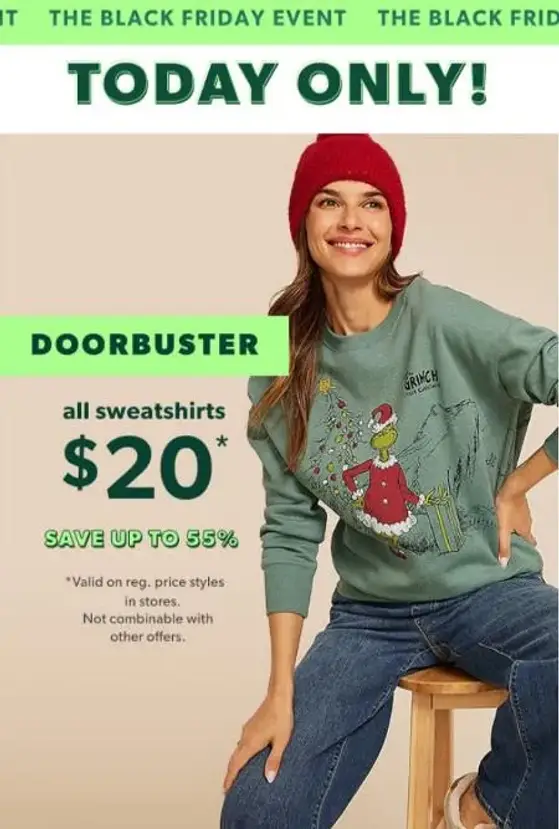 Get it now! Shop in store and get sweatshirts now for only $20.